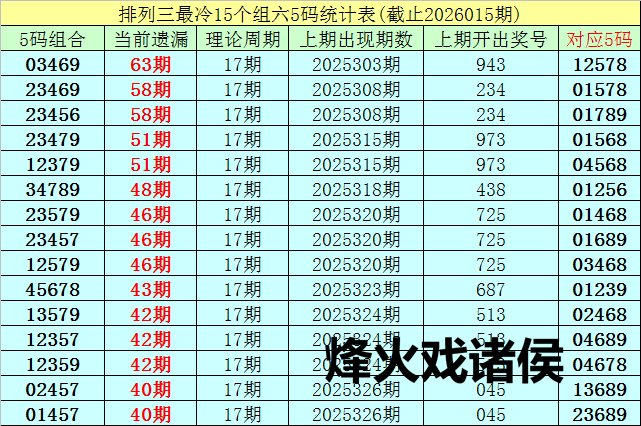 (5)摆设三当今遗漏值最大的5码组六组合为:03469,本期遗漏63期,短期解冻的可能性较小,则26016期奖号漫衍在03469-12578之中的可能性最大。